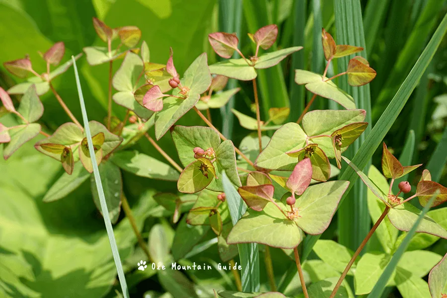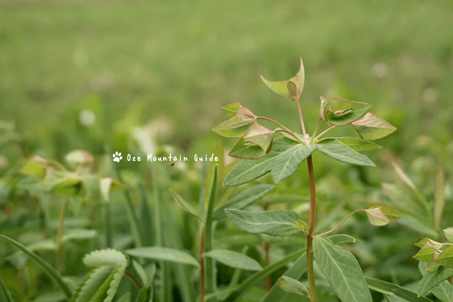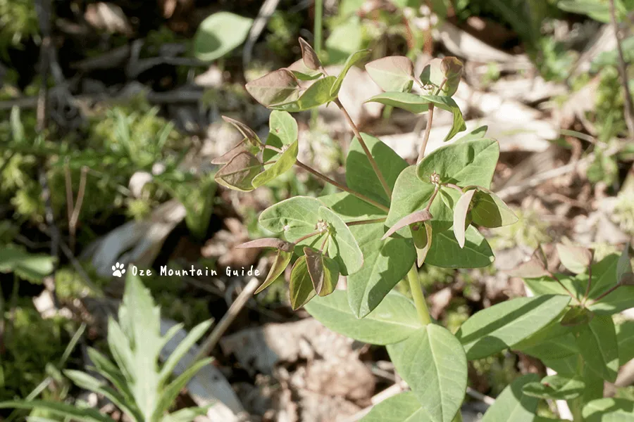 と見分けるコツは色です。 ナツトウダイは赤くオゼヌマタイゲキは黄緑色をしています。