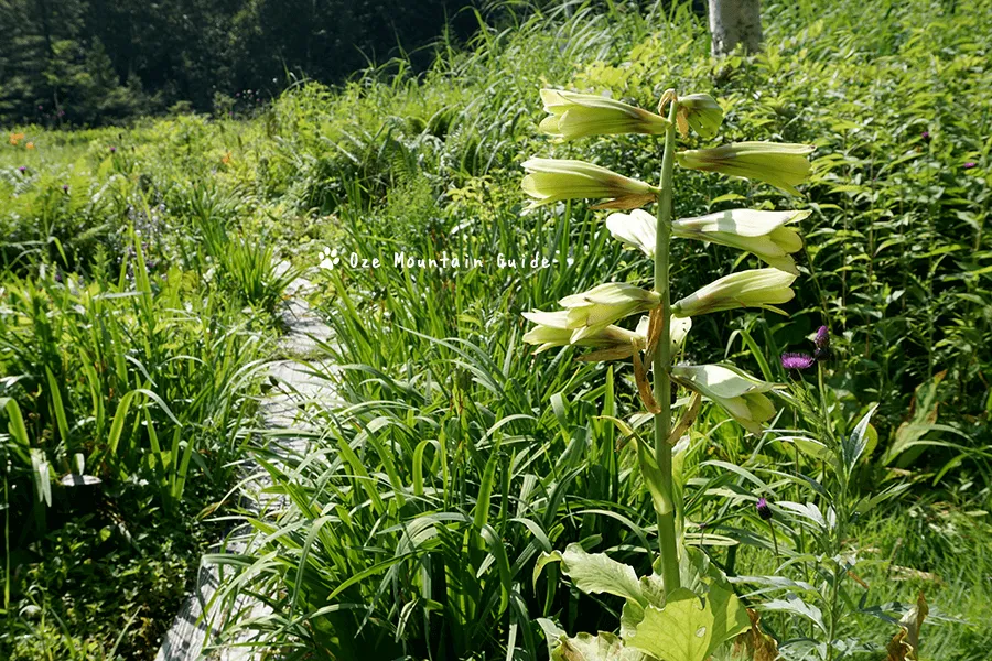 尾瀬で植物で最大級の大きさになるオオウバユリ。 大きなものだと2mを超えるサイズに成長します。 オオウバユリの茎の太さは樹木並みになりますよ。