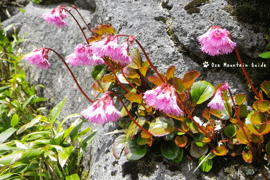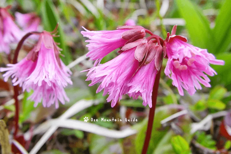 独特な花の形と目立つ色のイワカガミ。尾瀬に春を告げる植物の一つです。