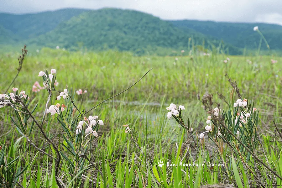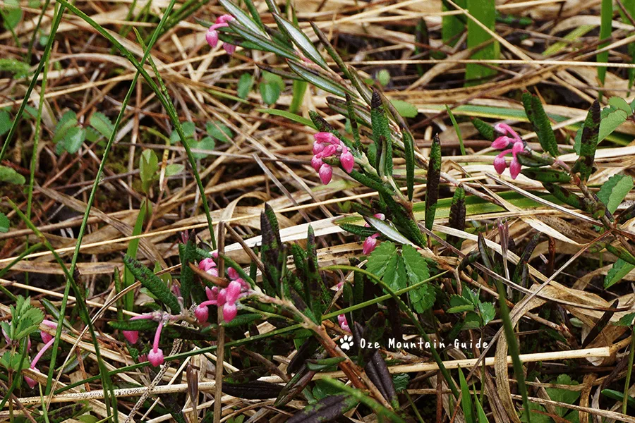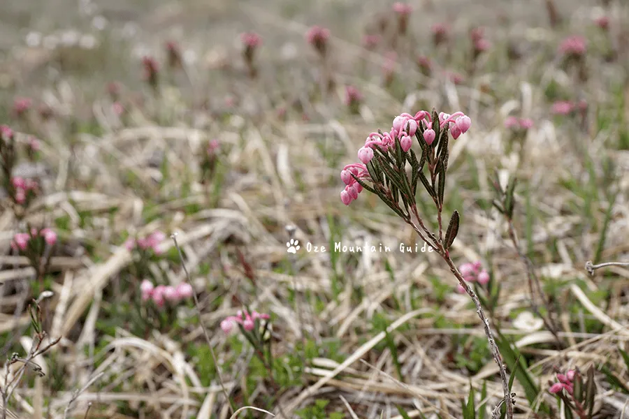 尾瀬の湿原で、ピンクの可愛らしい花をつけるヒメシャクナゲ。