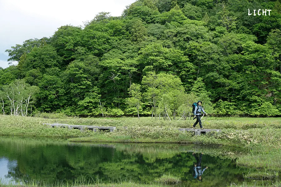 上ノ大堀の池塘は、ちょっとした撮影スポット。歩いている人がキレイに池塘に映りこみます。