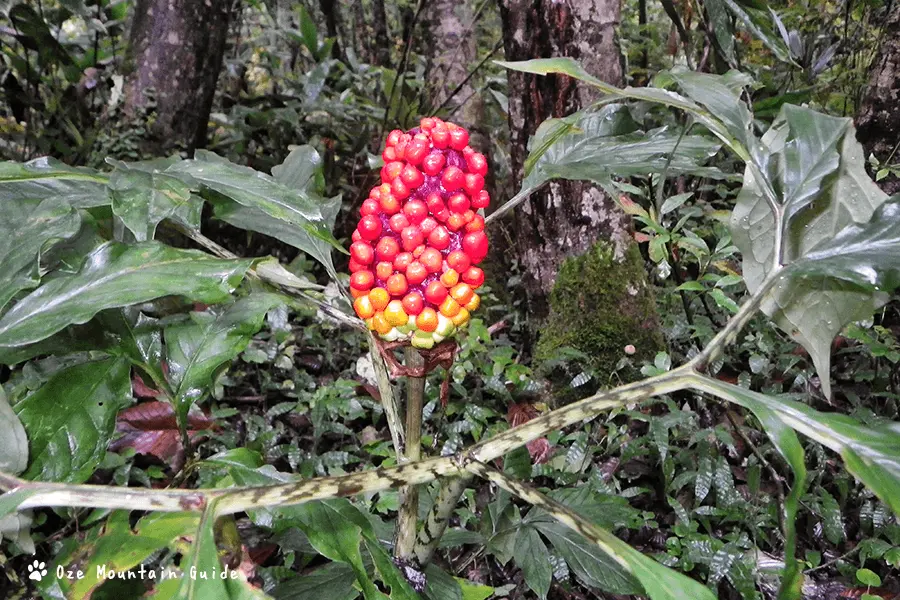 見た目がとても派手で尾瀬の林道でよく目立つマムシグサ。 実の鮮やかな色に目を奪われますが、茎にも注目してください。 茎の模様が縞々のマムシ柄なんですね。