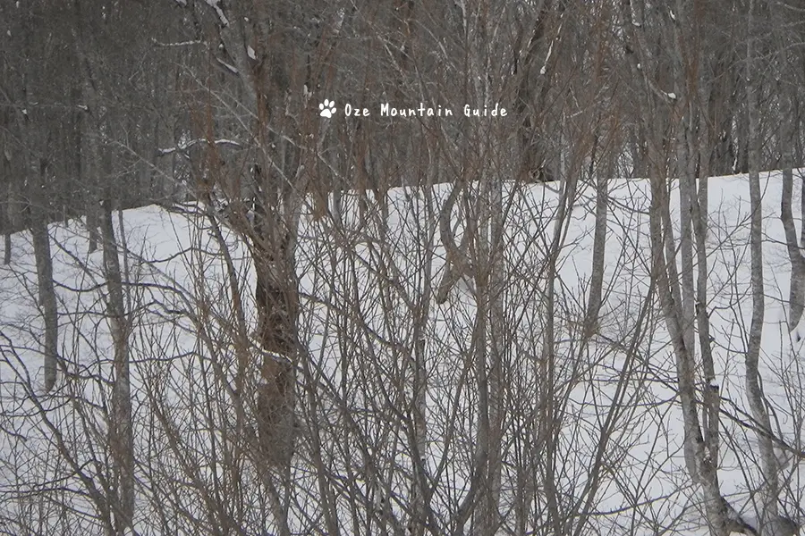 写真の中にカモシカが隠れています。 尾瀬の森の中ですがどこにいるか分かりますか?なかなか見つかりづらいです。 なかなかカモシカは近くで撮らせてくれません。すぐに逃げて行ってしまいます。