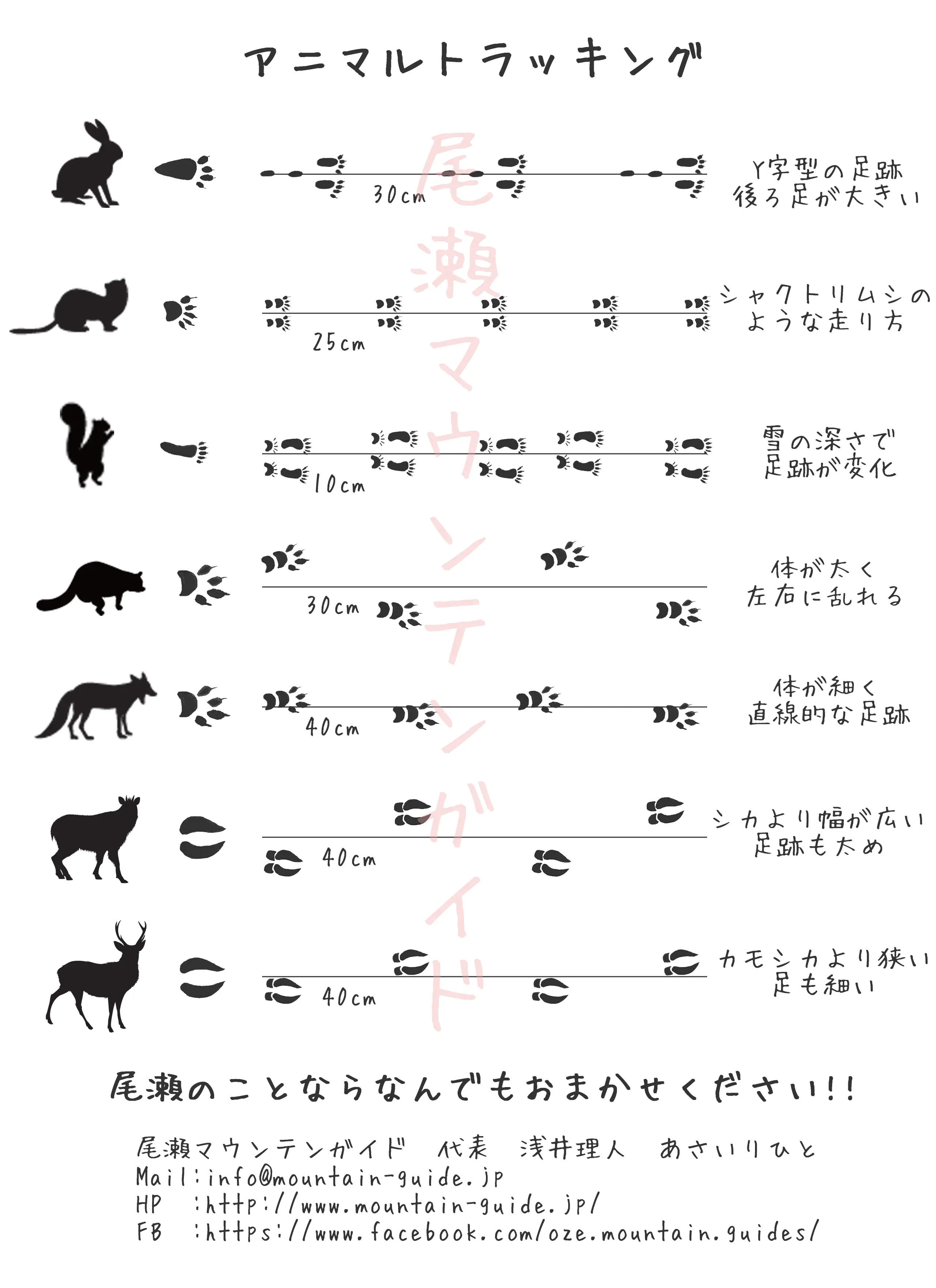 アニマルトラッキング早見表を作ってみました。 尾瀬周辺でよく見られる動物達です。 子供でもすぐに分かるように動物のシルエットを使ったアニマルトラッキング表になっています。