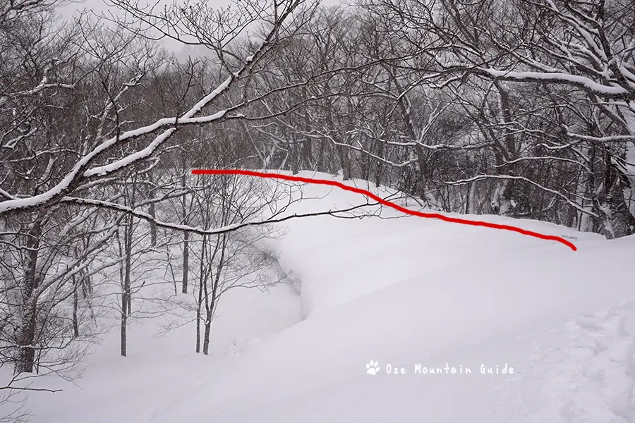 冬道の雪庇がだいぶ割れてきました。 (林道終点の駐車場から上がった尾根の部分) 赤線の部分に割れ目が入っています。