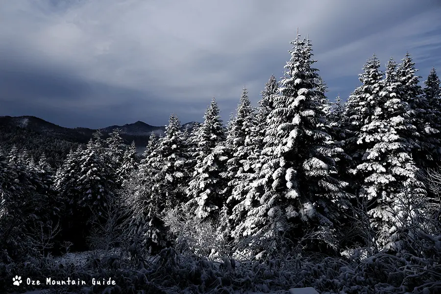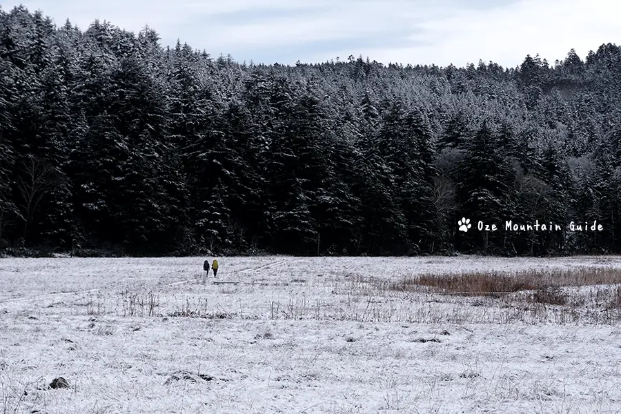 銀世界になった尾瀬沼へ。 光の差し込む樹林帯は、いつもと違った尾瀬の表情を見せてくれます。 白くなった湿原は少しもの悲しく、冬の訪れを感じさせてくれます。