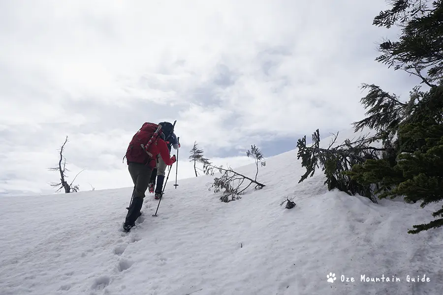 今日は御池から俎嵓へ登り、長英新道から尾瀬沼へ下山し尾瀬沼ヒュッテに泊まっています。 道中はすべて雪のロングコース。距離にすると12km。標高差800mです。