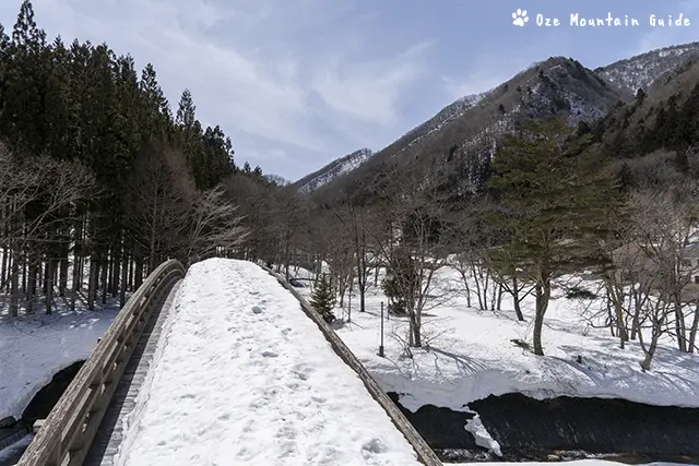 3枚目は檜枝岐川です。端まで寄るとぼこっと雪が崩れそう。4枚目は太鼓橋になります。ようやく手すりの高さまで雪が解けてきました。