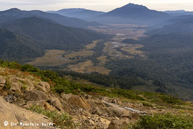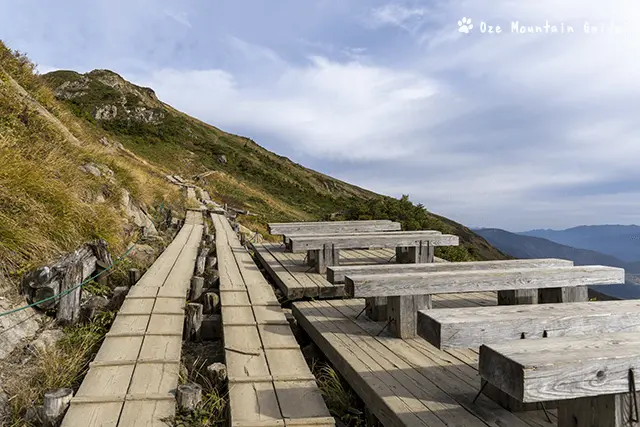 1枚目は朝日を浴びて赤くなった至仏山。2枚目は尾瀬ヶ原と燧ヶ岳の遠望。3枚目は蛇紋岩の塊。4枚目は休憩に最適なベンチです。