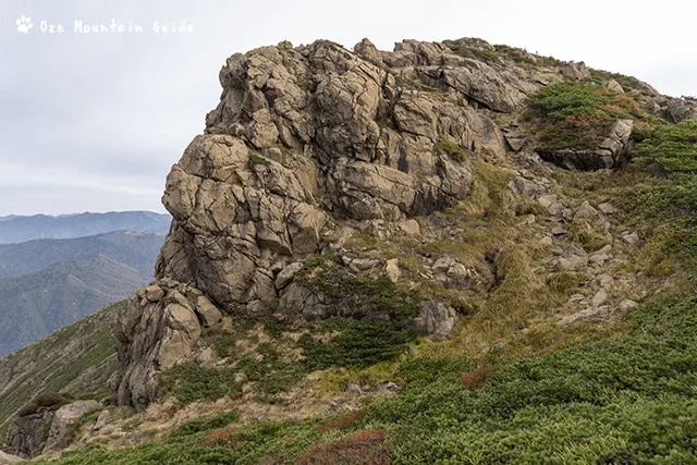 花が有名の至仏山ですが秋も素晴らしい場所です。特に山頂から小至仏山へと続く稜線は見応えがあります。蛇紋岩と灌木の紅葉の対比が綺麗です。